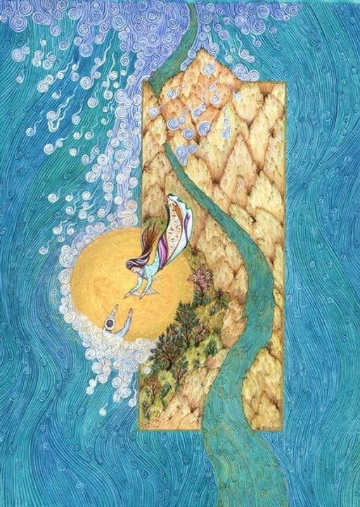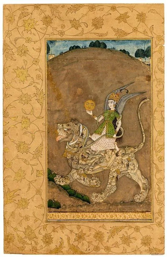 Art on the left: A Sun-bearing Peri Rides a Composite Lion