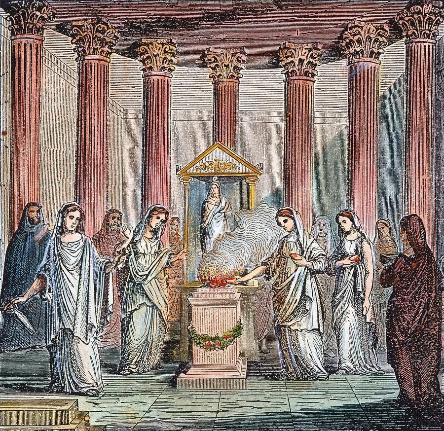 In Ancient Rome, a significant place was given to a deity that was barely visible in myth or stories. The deity's name is Vesta (Roman version of Hestia), the goddess of the hearth, home and family. She was barely depicted as a statue or in any concrete form and was simply represented by the fire. Her temple was in the Forum Romanum and only her Vestals were allowed to enter. Her priestesses would swear a thirty year long chastity vow and dedicate almost their entire lives in the service of the goddess, and most importantly, in making sure that the fire does not go out. A Vestal, once she took the vow, was no longer under her father's legal patronage. if she broke the vow of chastity, she would be buried alive. The punishment for allowing the fire to go out was whipping.